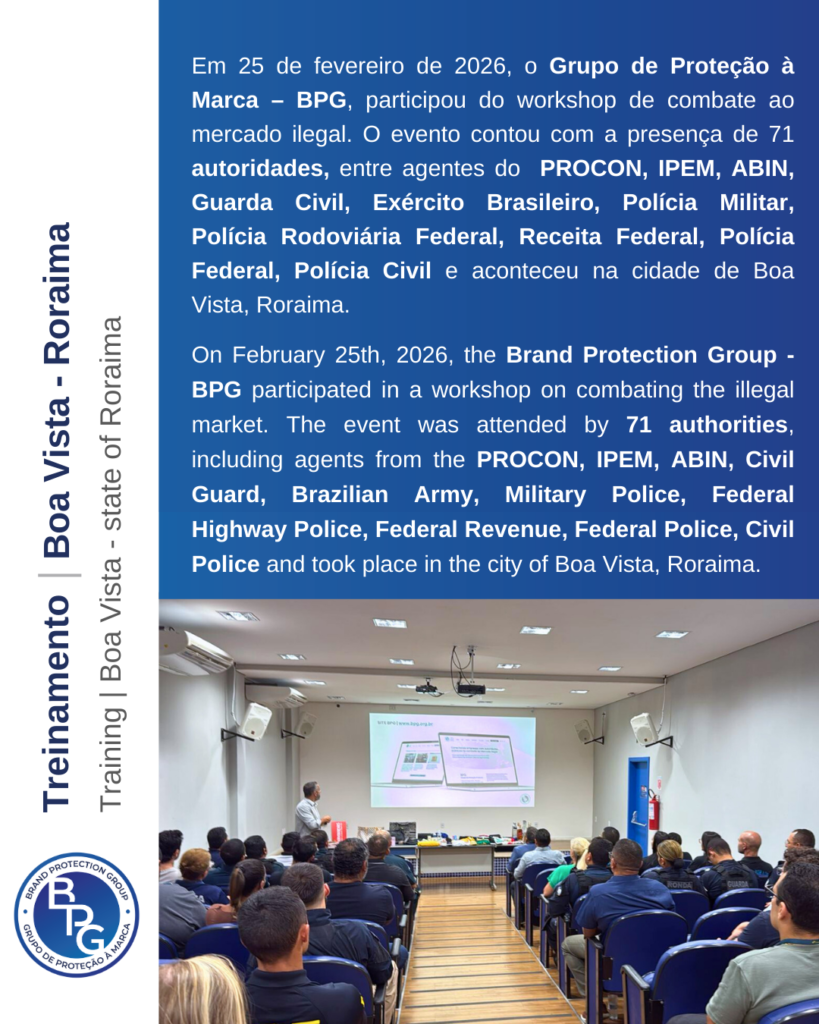 Em 25 de fevereiro de 2026, o Grupo de Proteção à Marca – BPG, participou do workshop de combate ao mercado ilegal. O evento contou com a presença de 71 autoridades, entre agentes do PROCON, IPEM, ABIN, Guarda Civil, Exército Brasileiro, Polícia Militar, Polícia Rodoviária Federal, Receita Federal, Polícia Federal, Polícia Civil e aconteceu na cidade de Boa Vista, Roraima.