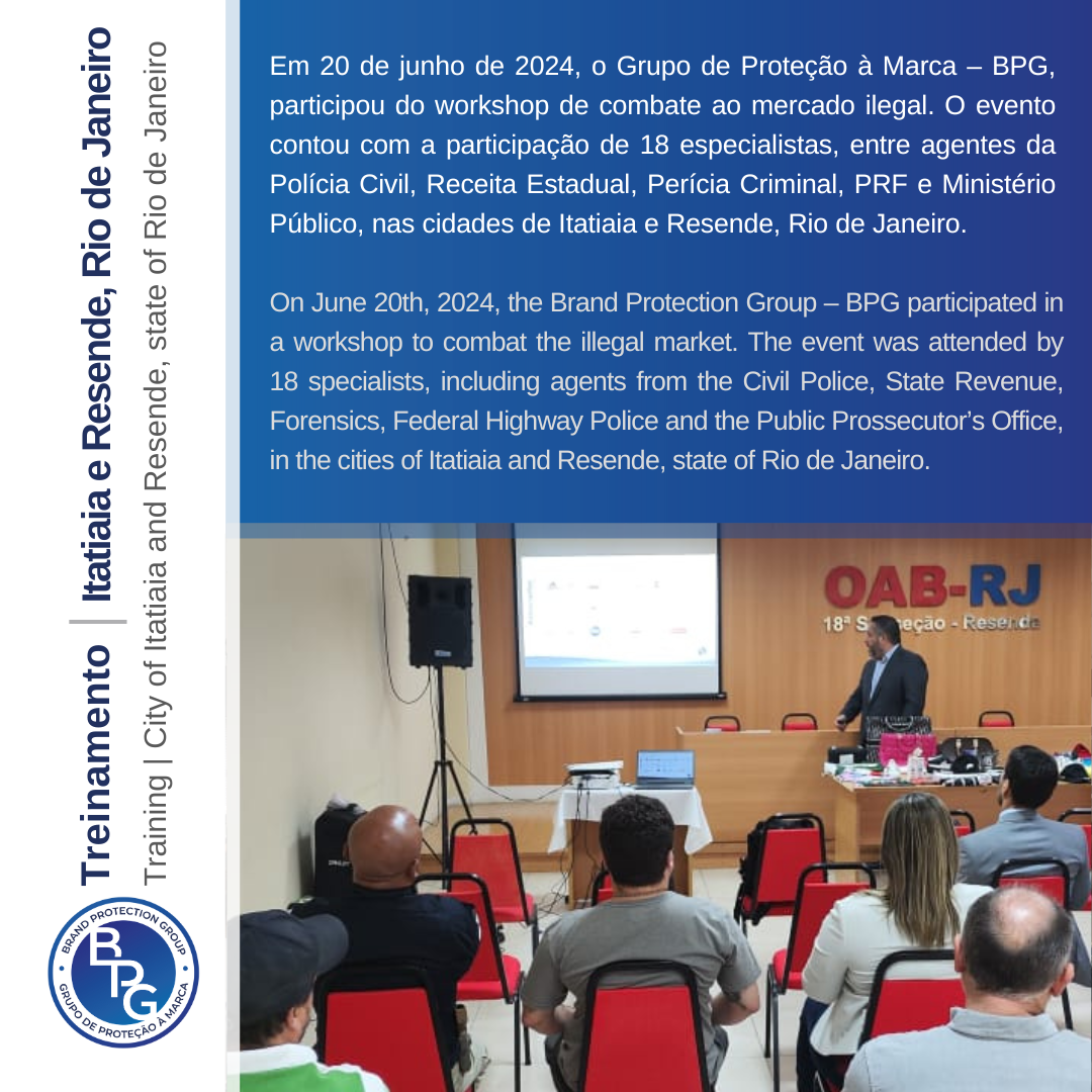 Em 20 de junho de 2024, o Grupo de Proteção à Marca – BPG participou de um treinamento para autoridades públicas, que reuniu 18 especialistas, entre agentes da Polícia Civil, Receita Estadual, Perícia Criminal, PRF e Ministério Público, nas cidades de Itatiaia e Resende, Rio de Janeiro.