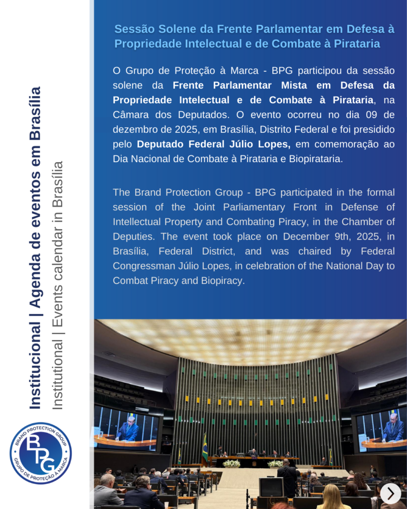The Brand Protection Group – BPG participated in the formal session of the Joint Parliamentary Front in Defense of Intellectual Property and Combating Piracy, in the Chamber of Deputies. The event took place on December 9th, 2025, in Brasília, Federal District, and was chaired by Federal Congressman Júlio Lopes, in celebration of the National Day to Combat Piracy and Biopiracy.