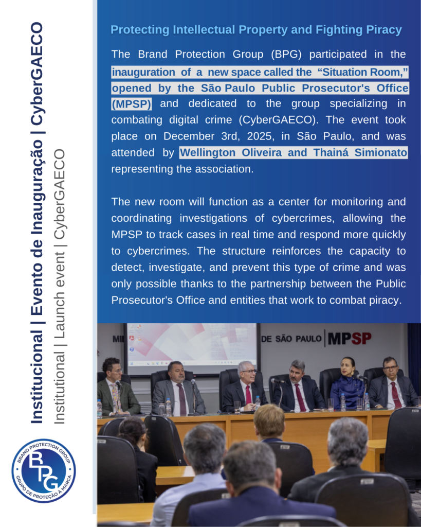 The Brand Protection Group – BPG participated in the inauguration of a new space, called the “Situation Room,” opened by the São Paulo Public Prosecutor’s Office (MPSP) and dedicated to the Group specializing in combating digital crime (CyberGAECO). The event took place on December 3, 2025, in São Paulo and was attended by Wellington Oliveira and Thainá S. Marques, representing the association.