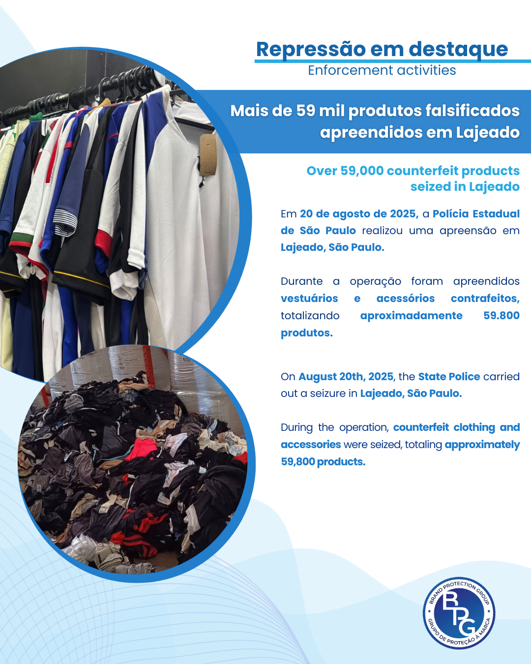 On August 20th, 2025, the State Police carried out a seizure in Lajeado, São Paulo. During the operation, counterfeit clothing and accessories were seized, totaling…