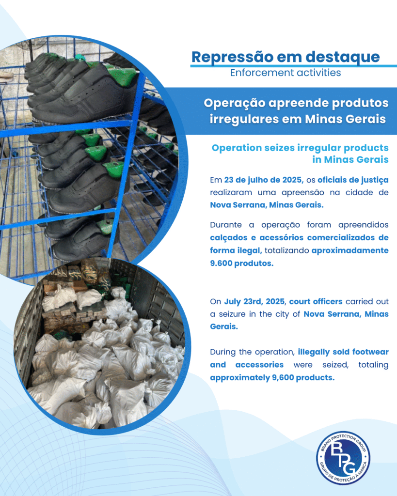 Durante a operação foram apreendidos calçados e acessórios comercializados de forma ilegal, totalizando aproximadamente 9.600 produtos. A ação foi acompanhada pelos representantes das associadas do BPG.
