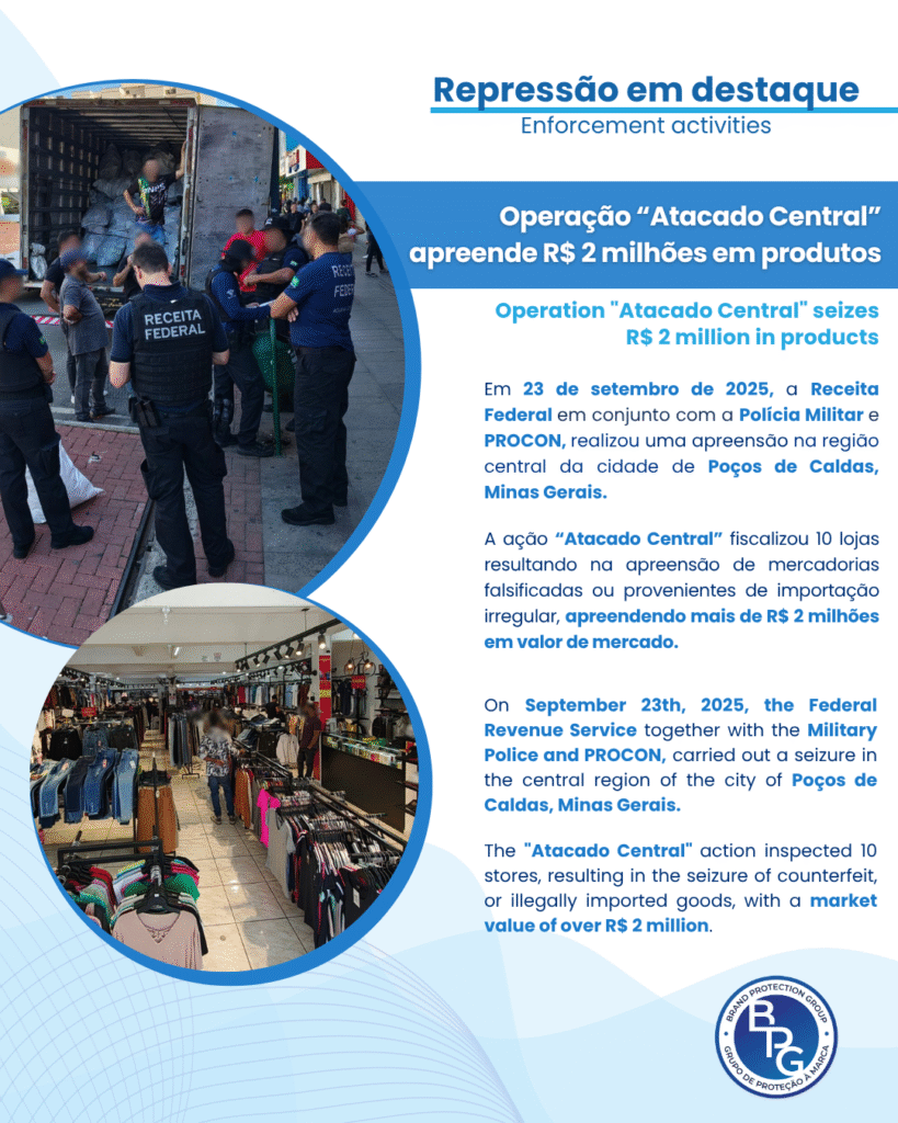 A ação “Atacado Central” fiscalizou 10 lojas resultando na apreensão de mercadorias falsificadas ou provenientes de importação irregular, apreendendo mais de R$ 2 milhões em valor de mercado.