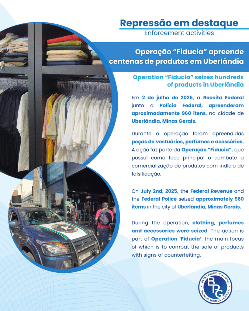 Durante a operação foram apreendidas peças de vestuários, perfumes e acessórios. A ação faz parte da Operação “Fiducia”, que possuí como foco principal o combate a comercialização de produtos com indício de falsificação.