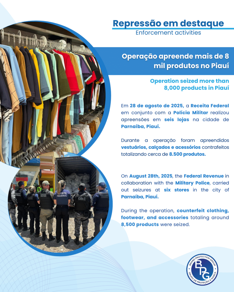 Durante a operação foram apreendidos vestuários, calçados e acessórios contrafeitos totalizando cerca de 8.500 produtos.