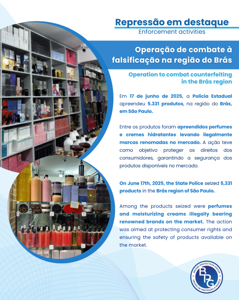 Entre os produtos foram apreendidos perfumes e cremes hidratantes levando ilegalmente marcas renomadas no mercado. A ação teve como objetivo proteger os direitos dos consumidores, garantindo a segurança dos produtos disponíveis no mercado. A ação foi acompanhada pelos representantes das associadas do BPG.