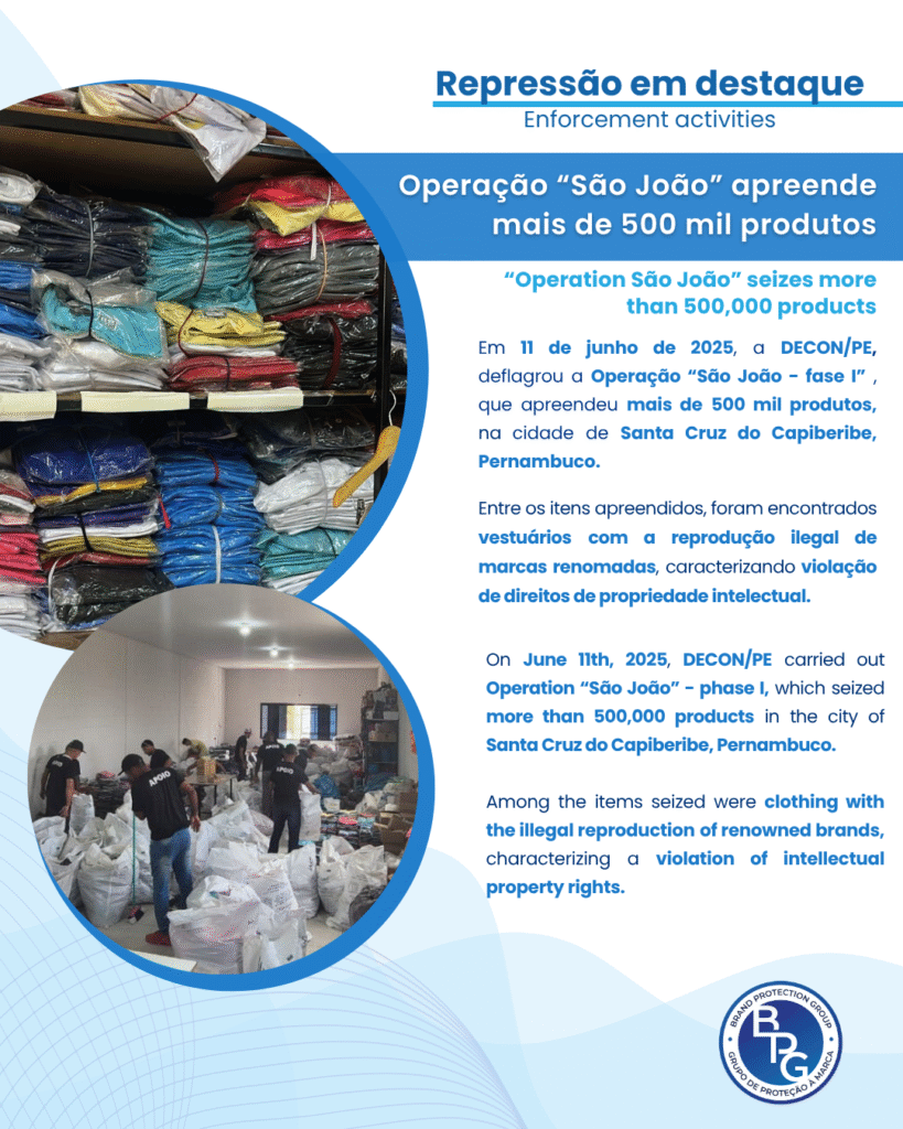 Entre os itens apreendidos, foram encontrados vestuários com a reprodução ilegal de marcas renomadas, caracterizando violação de direitos de propriedade intelectual.  A ação foi acompanhada pelos representantes das associadas do BPG.