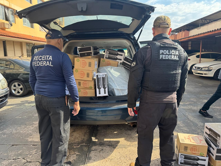 Em um dos edifícios vistoriados, foi localizado um depósito ilegal com centenas de garrafas de vinho argentino, além inúmeros aparelhos eletrônicos, provenientes do Paraguai, acondicionados no interior de um apartamento.